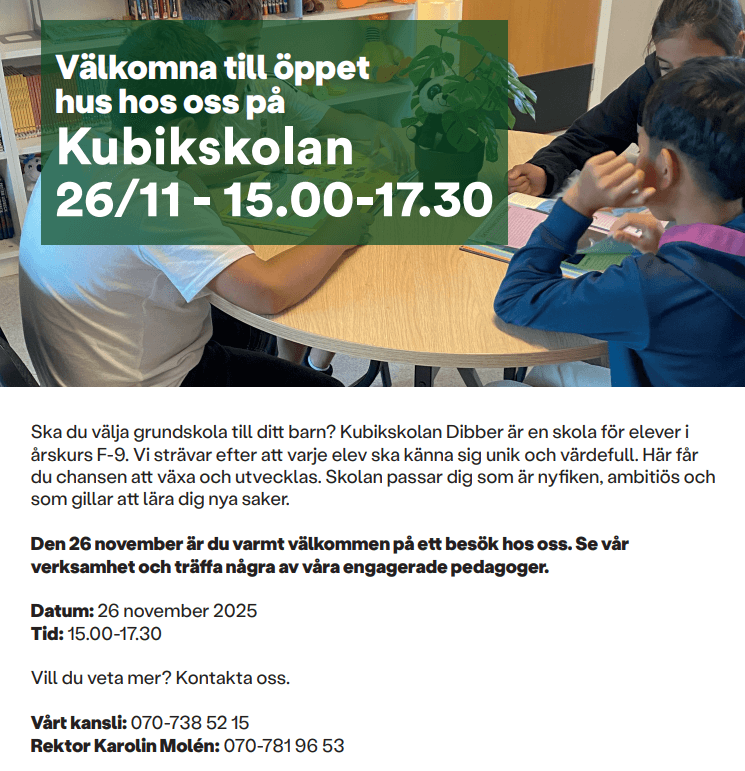 Boka din en personlig visning genom att höra av dig till vårt kansli via kansli.kub@edu.dibber.se eller 070-738 52 15, 073-898 87 06